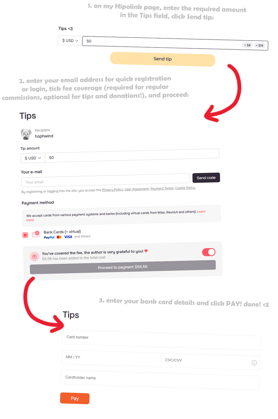 1.2.2 Starting from 11/06/2023, it is required for your payment amount to be added by additional 12% to cover Boosty Agency Fee (1) / Hipolink Service Commission (2) and the commission from the Creator Fee (3) / Hipolink Fee (4) (10% and 1.7% accordingly for both sites, rounded up to 12%) Boosty and Hipolink are taking from their Authors. This means whatever commission you're paying for, you'll have to pay 12% more. For example, if your commission is $150, you'll have to send a payment of $168. Hoping for your understanding!NOTE: THE RULE ABOVE IS ONLY APPLICABLE TO COMMISSIONS. COVERING FEES FOR THE YCHES BOUGHT FROM ME THROUGH AUCTIONS IS TOTALLY OPTIONAL AND IS JUST A WAY TO SUPPORT ME.UPDATE: as of October 2024, there's no PayPal option on any of the platforms. It's being fixed, but taking a while already. Currently only bank cards and virtual cards are accepted. Some American banks can reject your payments, so getting a virtual PayPal card is preferable.A short guide is present on the following page: